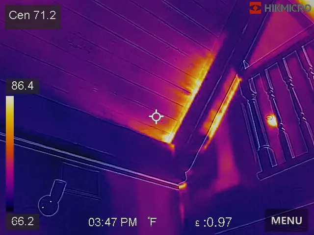使用高解析度的HIKMICRO Pocket2,在一組屋脊谷底檢查一位客戶房屋嚴重結冰問題。