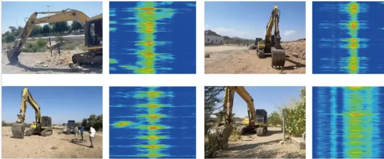 圖 2:TTRA 管線沿線不同地點之機械開挖作業範例。(左)為各作業地點於開挖開始前的現場影像,(右)為對應於開挖作業期間所量測之分散式聲學感測(DAS)瀑布圖。