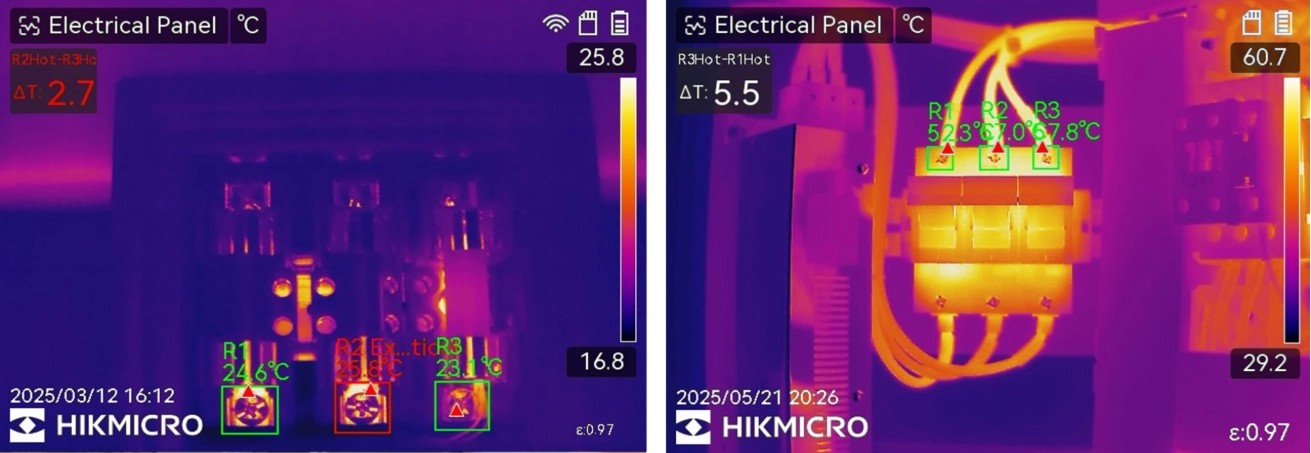 在配電盤檢查中,影像辨識與溫差 (ΔT) 演算法相結合,