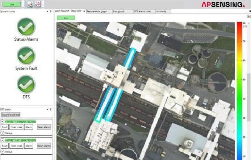 圖2.AP感測DTS系統介面,顯示工業設施的即時溫度監控、狀態、警報及區域細節
