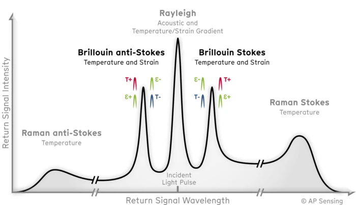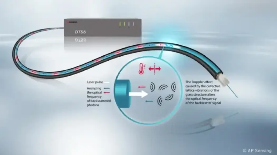 DTSS技術基於布里淵光散射原理,可響應光纖沿線的溫度和應變變化。當雷射脈衝注入光纖時,由於與光纖材料的相互作用,光會發生散射。反向散射的光學特性,例如頻率和振幅,會隨光纖的溫度和應變而變化。系統會持續分析這些數據。此系統利用光時域反射儀(OTDR)透過測量返回訊號的延遲來精確定位變化發生的位置,其原理與雷達類似。
