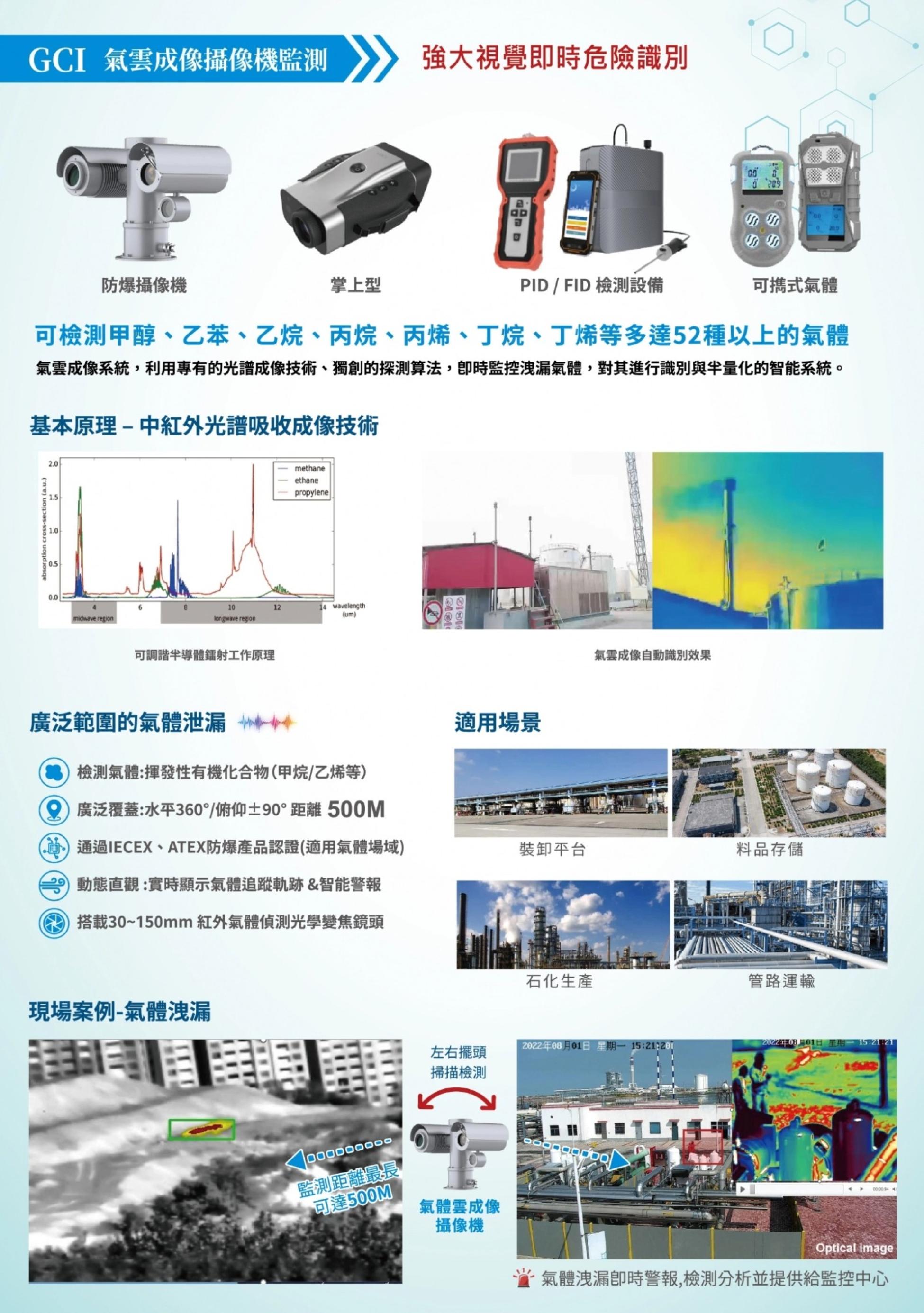 氣雲成像系統,利用專有的光譜成像技術、獨創的探測算法,即時監控洩漏氣體,對其進行識別與半量化的智能系統。